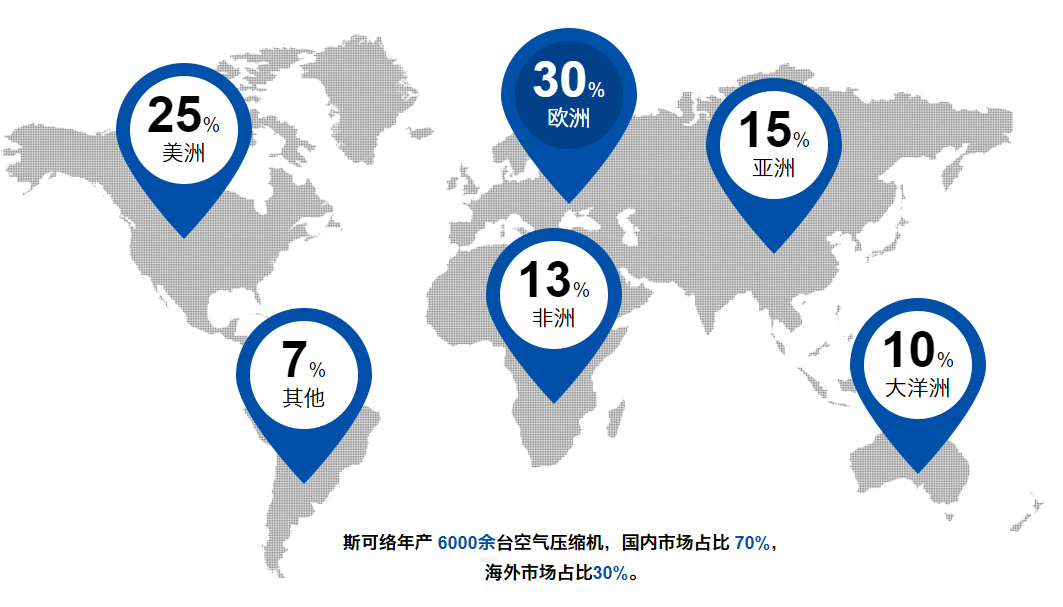 斯可絡全球化的經營戰略,鑄就空壓機行業品牌地位。斯可絡商標已在世界50多個國家注冊,遠銷歐洲、美洲、大洋洲、東南亞中東及非洲等,依托海外合資公司和歐美辦事處,遍及全球的銷售及服務網絡為客戶提供高能效的空氣壓縮機產品+節能環保空氣系統解決方案+快捷的技術服務與支持。