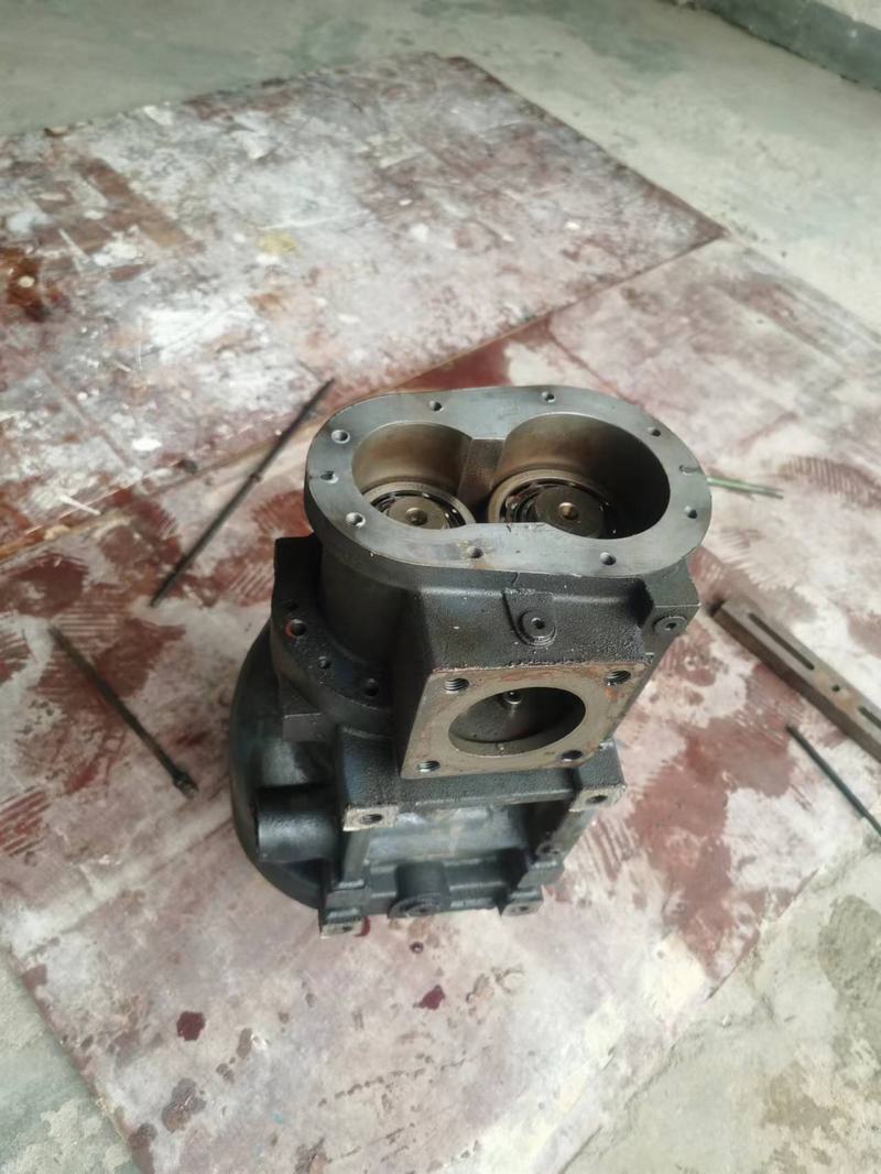 噴油雙螺桿空壓機主機(又稱機頭)的結構通常是一對相互嚙合的螺桿,主機殼體、高壓端及端蓋和低壓端蓋組合,各元件配合間隙是非常精密的。螺桿式空壓機主機是容積式的、空氣的壓縮是靠裝置于機殼內互相平行的陰陽轉子的齒槽之容積變化而達到。轉子附在與它精密配合的機殼內轉動、使轉子齒槽之間的氣體不斷地產生周期性的容積變化而沿著轉子的軸線,由吸入端推向排出端,完成吸入、壓縮、排氣三個工作過程。